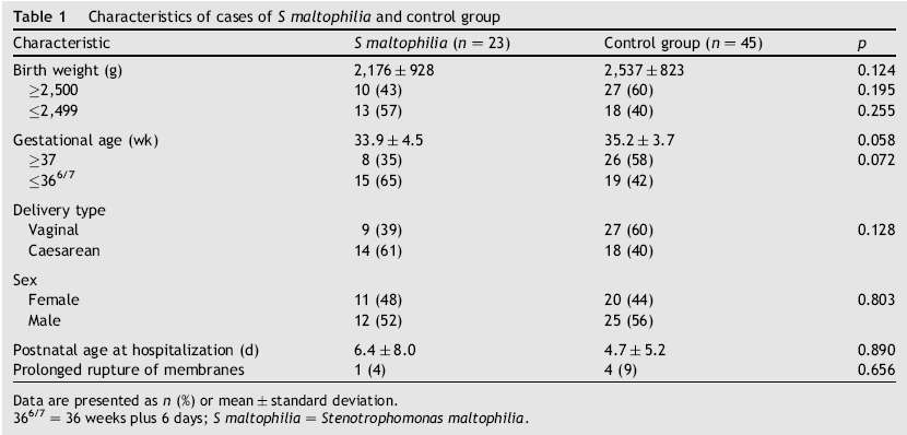 Este estudio retrospectivo de casos - controles pareados se llevó a cabo en recién nacidos con infecciones por S maltophilia en la UCIN de la Universidad Técnica de Karadeniz entre 2003 y 2008. Para identificar los pacientes casos los autores revisaron los registros médicos de pacientes en la UCIN y los registros del Departamento de Microbiología en el período de estudio. Los pacientes usados como Control fueron seleccionados de entre los pacientes hospitalizados en la UCIN durante un mínimo de 72 horas y que tenían neumonia neonatal y / o sepsis nosocomial causada por otros agentes patógenos distintos a S maltophilia. Para determinar los factores de riesgo para infecciones por S maltophilia en recién nacidos, 23 pacientes - casos se compararon con 45 pacientes del grupo control-