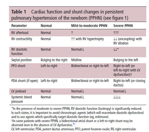 El shunt de derecha a izquierda a travpes de FOP disminuye la precarga del Ventrículo derecho . La poscarga del VD se puede reducir de forma transitoria mediante un shunt por DAP de derecha a izquierda si el Ductus permanece abierto. Los aumentos iniciales de la poscarga causan hipertrofia del VD y aumentan la contractilidad; sin embargo, la elevación persistente y excesiva de la RVP se asocia con estiramiento miocárdico, isquemia, hipoxemia y acidosis, lo que causa disfunción del VD (tabla 1) 5.