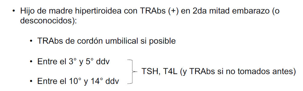 En caso de TRAbs (+) o desconocidos, en un RN asintomático y con función tiroidea normal, efectuar control clínico al mes y 2 meses de vida.